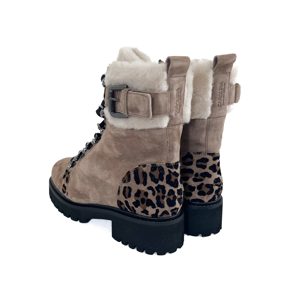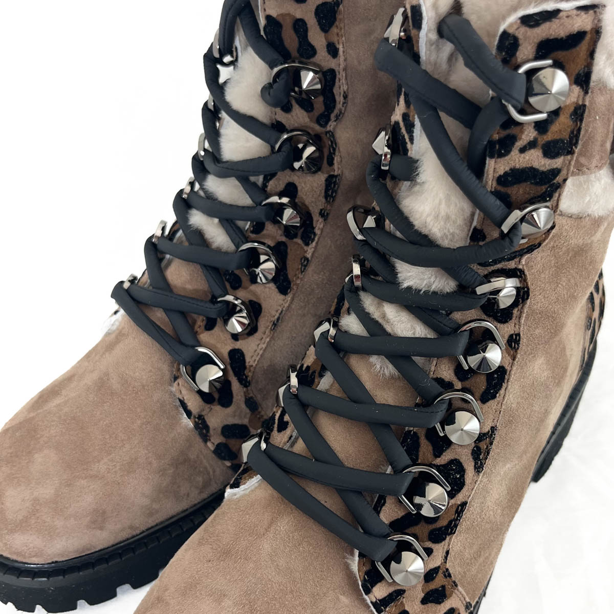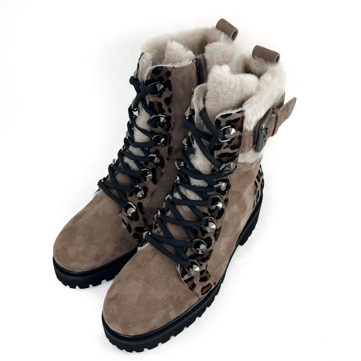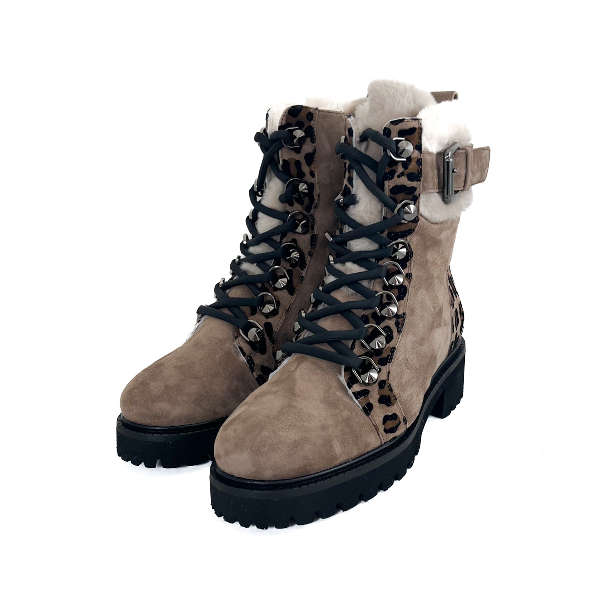 A bold leopard print accent runs along the lace eyelets and wraps around the heel, adding a touch of unexpected flair. This striking contrast gives the boot a fashion-forward appeal while maintaining its timeless versatility.