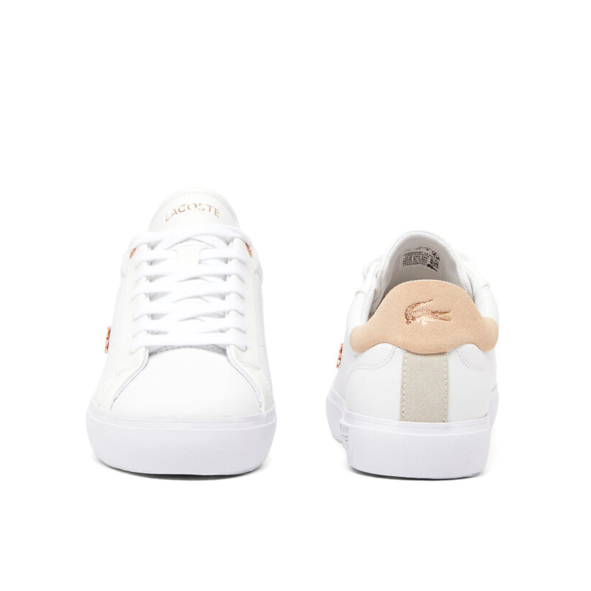 A standout feature, the rose gold Lacoste crocodile logo, proudly adorns the side and heel. This iconic branding adds a playful touch and makes this sneaker a statement piece. It embodies the spirit of Lacoste, blending heritage with contemporary fashion.