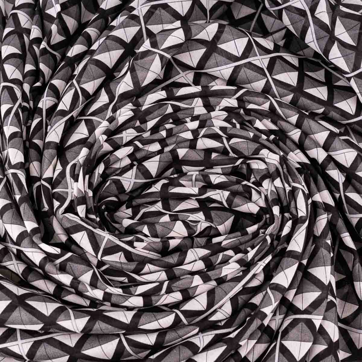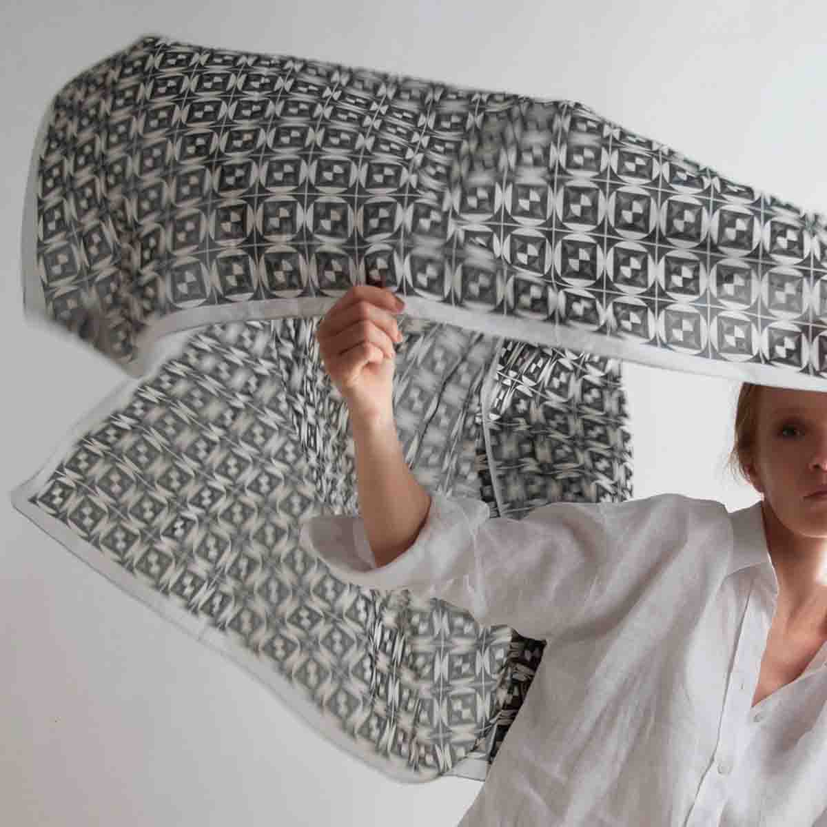 The design features bold geometries that evoke the graphic elegance of Escher and reinterpret the frescoes of the “Stories of San Benedetto” by Luca Signorelli and Antonio Bazzi. These captivating patterns, paired with a monochrome palette, make this scarf a versatile and timeless accessory for any wardrobe.